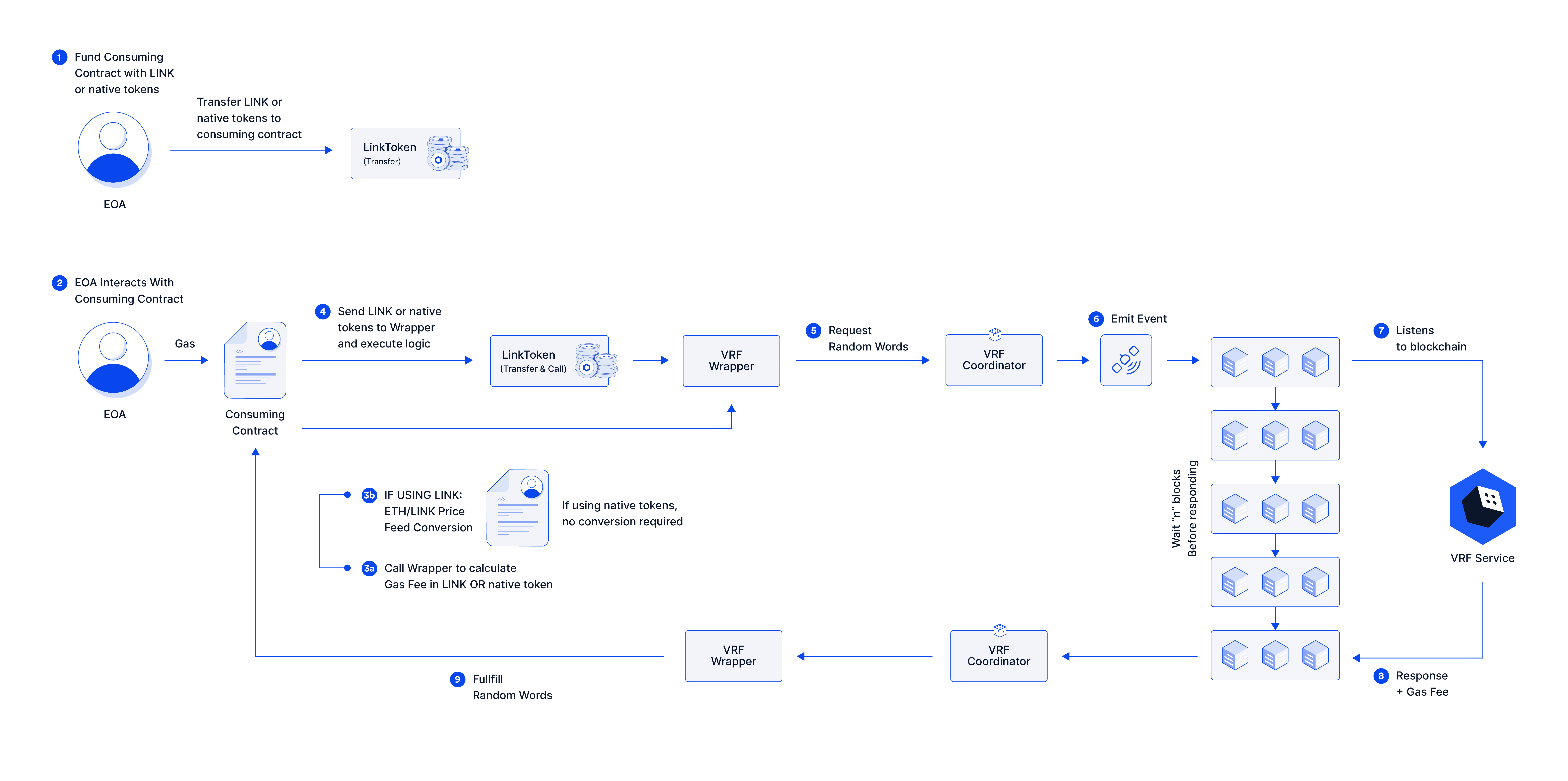 • VRF v2.5 Wrapper (onchain component): A wrapper for the VRF Coordinator that provides an interface for consuming contracts.